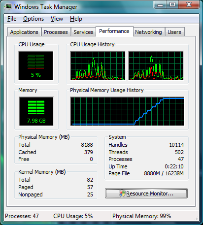 The next picture is as much a record of my unimaginativeness as of 32-bit Windows Vista actually using (very nearly) all the installed 8GB. An entirely ordinary test program writes 1GB of data from a single memory block to a file and reads the file back into that same memory block. That takes a while, even on a fast machine. By the time that eight instances are running concurrently, all the physical memory is in use: